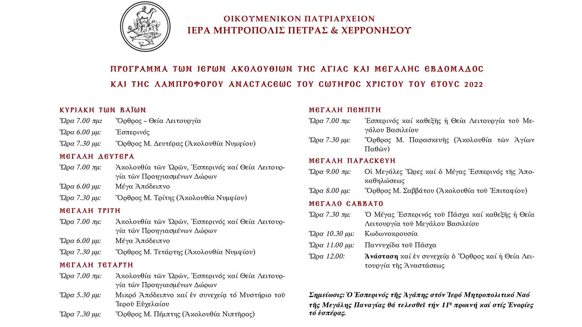 Απόψε Τρίτη θα τελεστεί ο Μέγας πανηγυρικός εσπερινός μετά αρτοκλασίας ώρα 6:30.